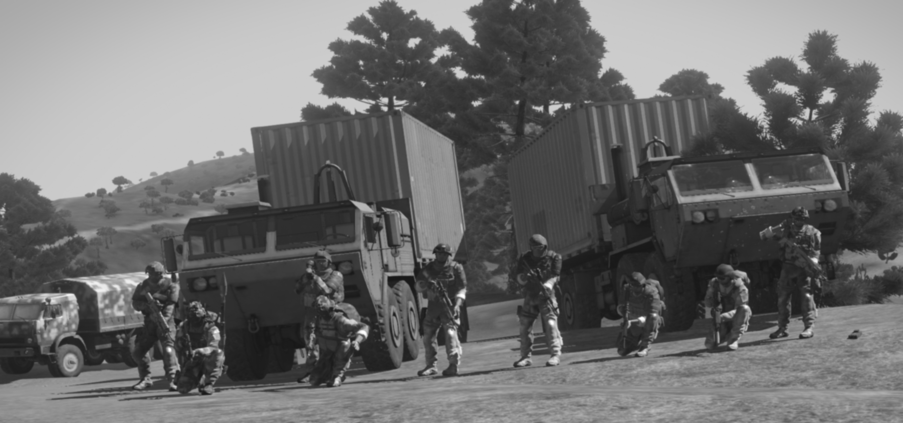 Une fois la menace traitée, nous avons affaire à un blindé qui débarque sur la montagne d'en face ainsi qu'a 2 pick-up qui arrivent par la route sur nos midi. Finalement retour au calme après s'être débarassés de ces véhicules. Le temps de réparer, remettre sur pied les gars et de ré-organiser le convoi avec un blindé récupéré que l'on place en tête du convoi.